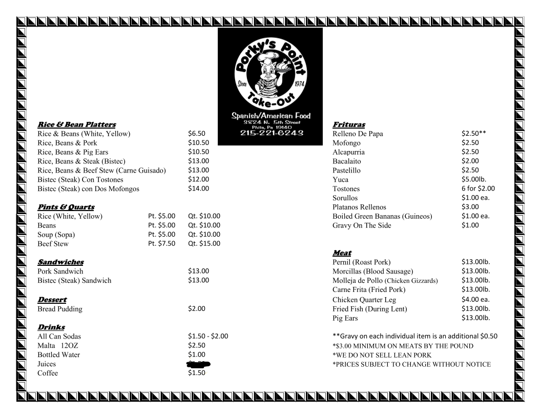Porky's Point Restaurant Menu
